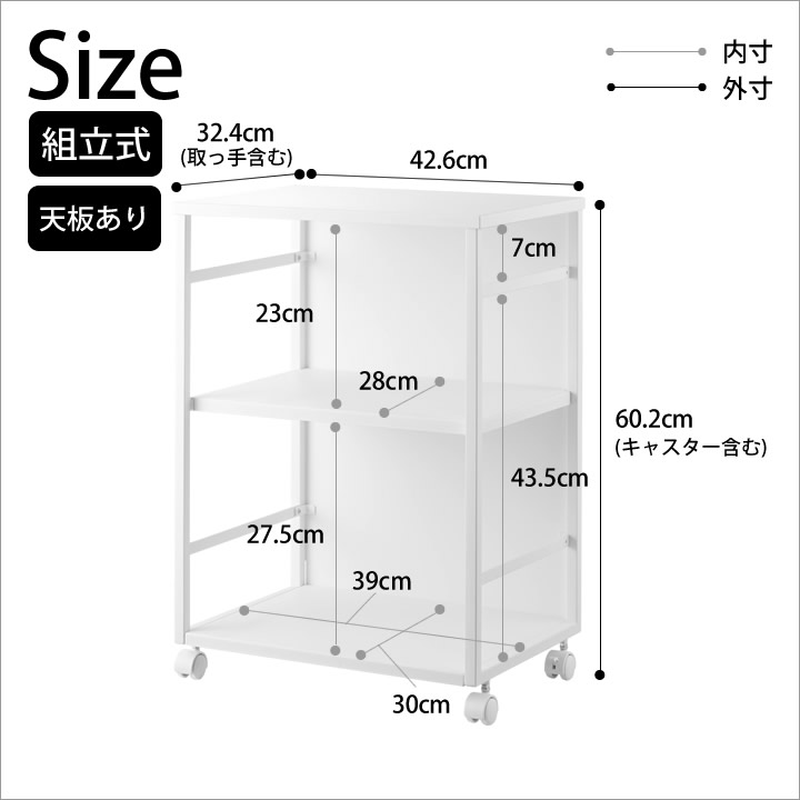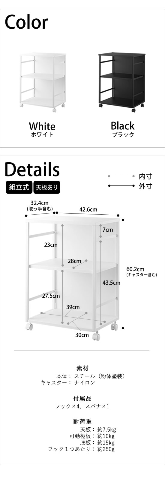 ![]() 天板の部分には、頻繁に使うトレイやキッチンタオルなど小物を置いても◎キッチンワゴンのようにちょい置きで使うのも便利です。天板があるおかげで、収納力がアップ。可動棚板は用途に合わせて3段階調整可能です。 ![]() |