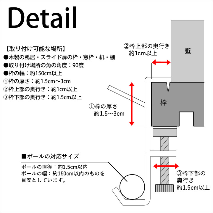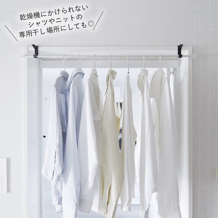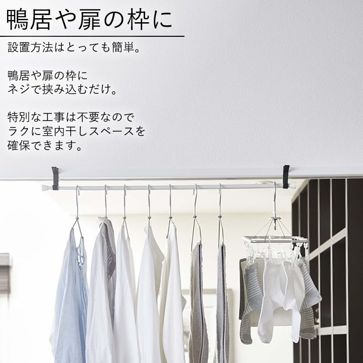 ![]() 設置方法はとっても簡単。 鴨居 や 扉 の枠にネジで挟み込むだけ。特別な工事は不要なのでラクに 室内干し スペースを確保できます。 ![]() |