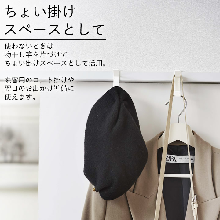 ![]() 使わないときは 物干し竿 を片づけて ちょい掛け スペースとして活用。来客用の コート掛け や翌日のお出かけ準備に使えます。 ![]() |