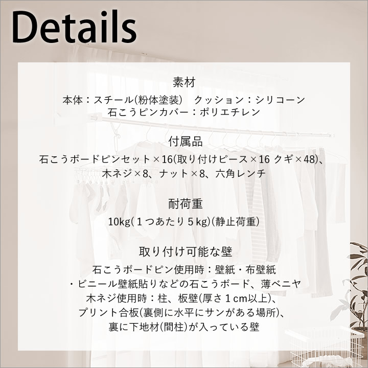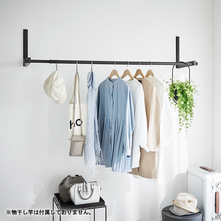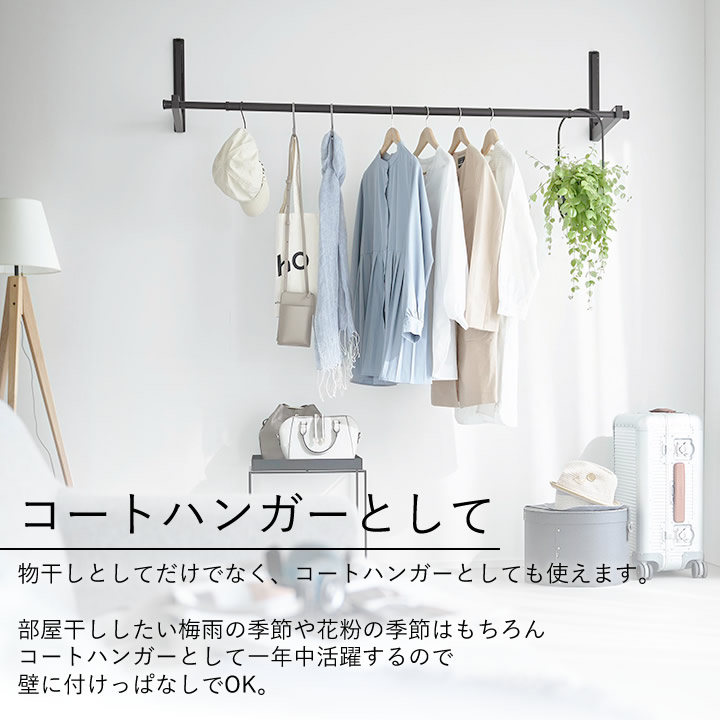 賃貸 でも安心の 石こうボードピン だから好きな場所に取り付けOK。使わないときは 物干し竿 を掛けたまま折りたためるから、見た目もスッキリ&邪魔になりません。