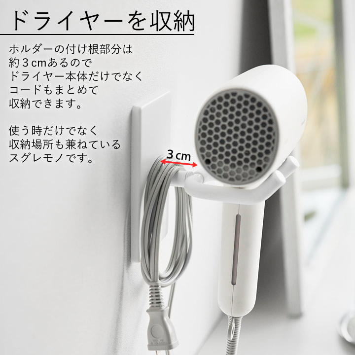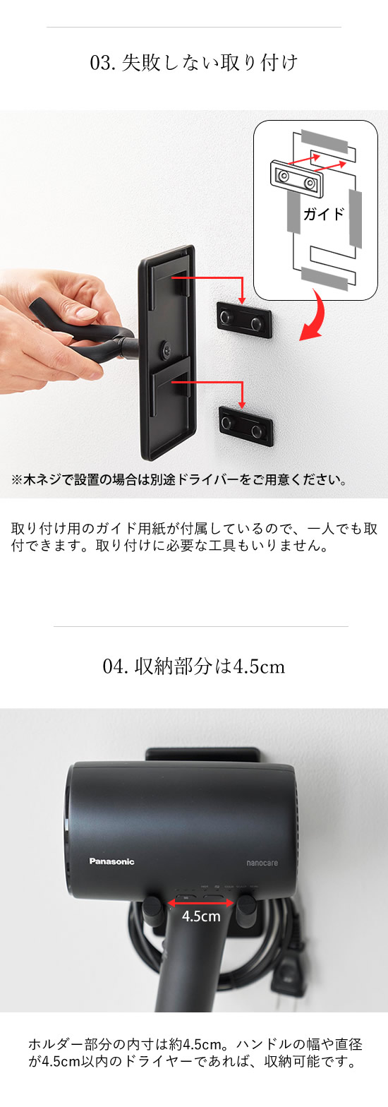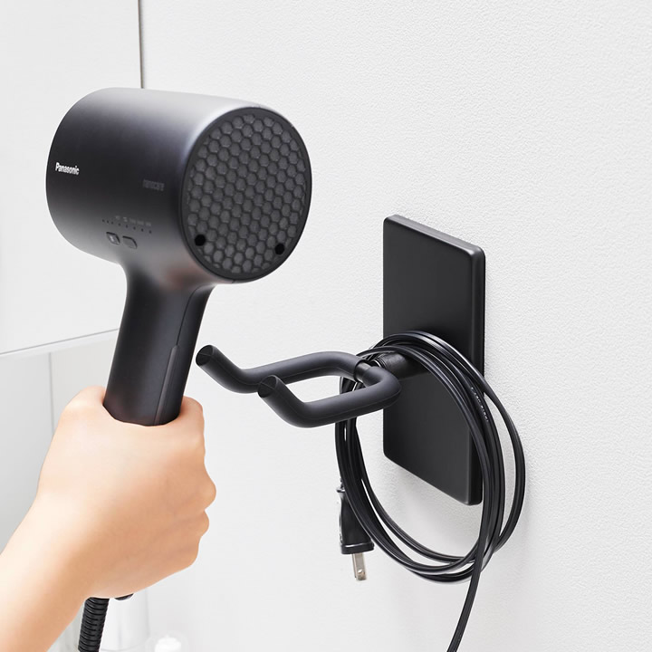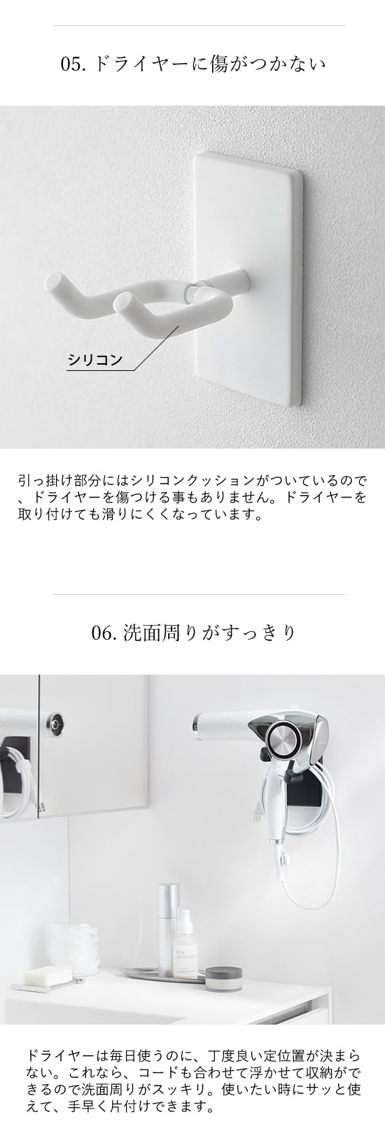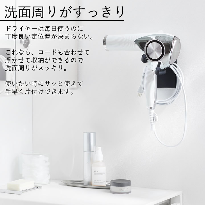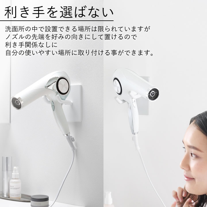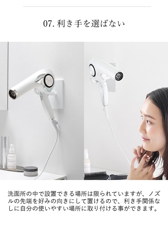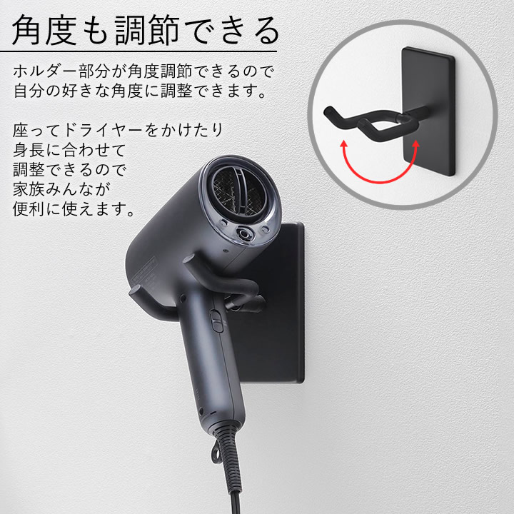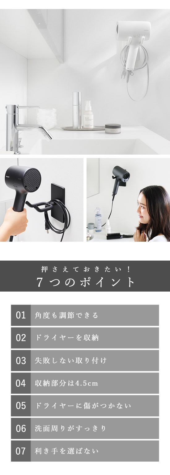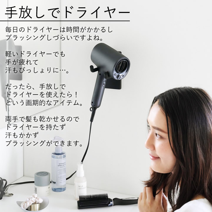 毎日のドライヤーは時間がかかるし、片手が塞がるからブラッシングしづらいですよね。 軽いドライヤーでも手が疲れて汗もびっしょりに…。 だったら、手放しでドライヤーを使えたら!という画期的なアイテム。 ホルダー部分は好きな角度に調整可能。 身長に合わせて調整できるので、家族みんなが便利に使えます。 ホルダーの付け根部分にコードもまとめて収納できて、収納場所も兼ねているスグレモノ。 洗面台周りを広く使えます。 両手で髪を乾かせるので、ドライヤーを持たず汗もかかずブラッシングができます。