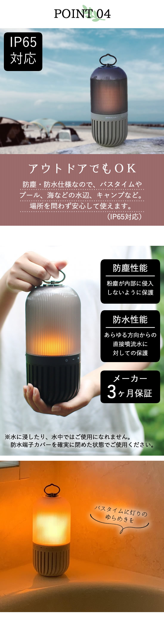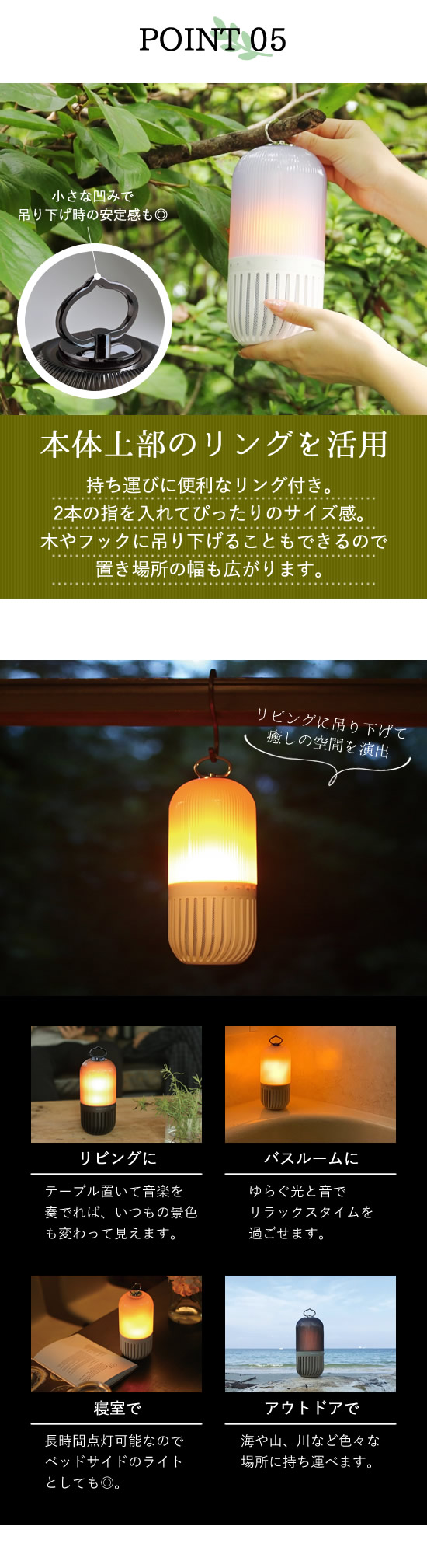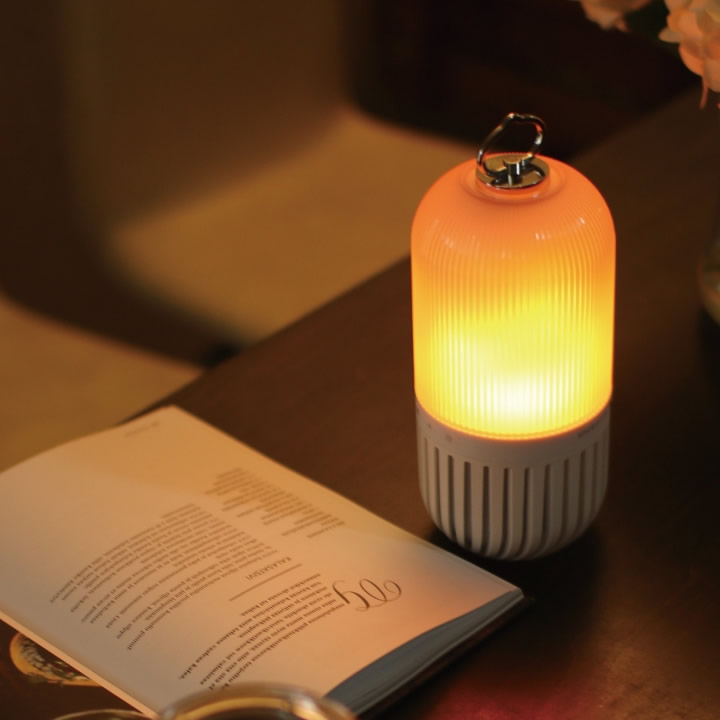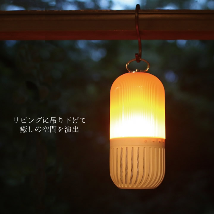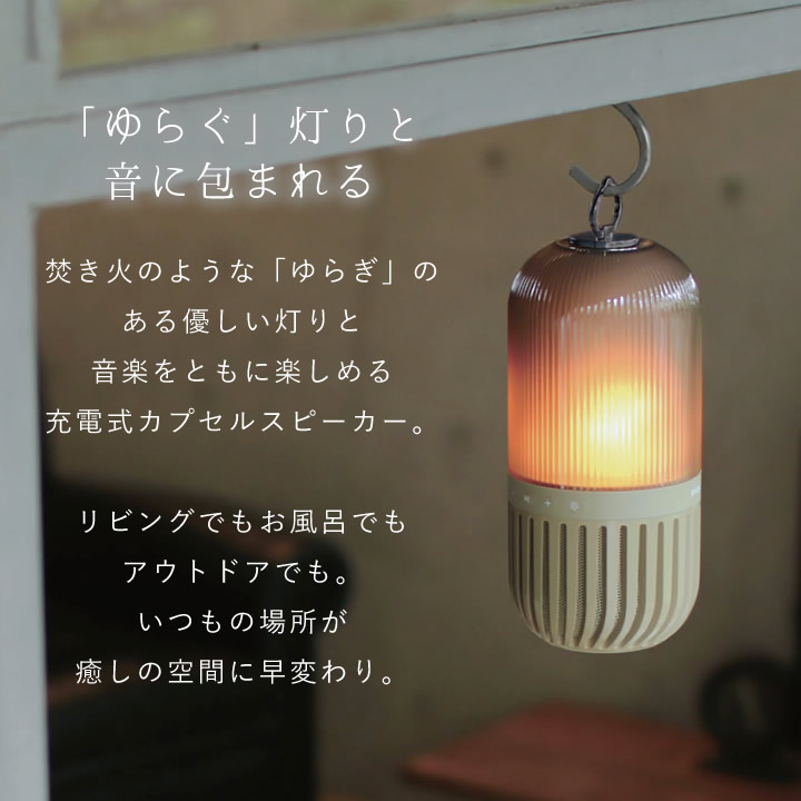 焚き火のように ゆらぐ優しい灯りと 音楽を共に楽しめる 充電式カプセルスピーカー 。 リビング や お風呂 でも どこでも使えるので いつものお部屋が 癒しの空間に大変身。 防塵・防水仕様で アウトドア でも活躍。 おうち以外でも特別な空間を お届けします。 いつもの場所に 癒しの空間を提供する カプセルスピーカー です。