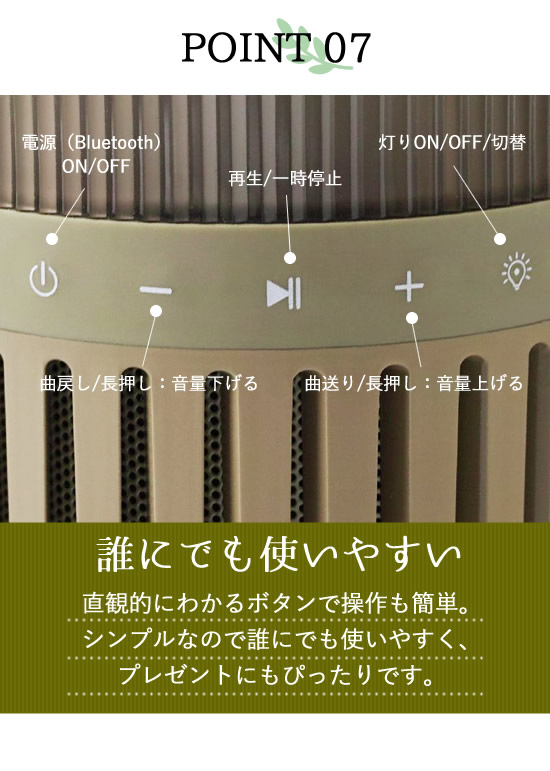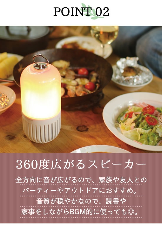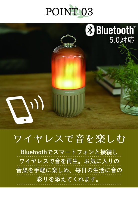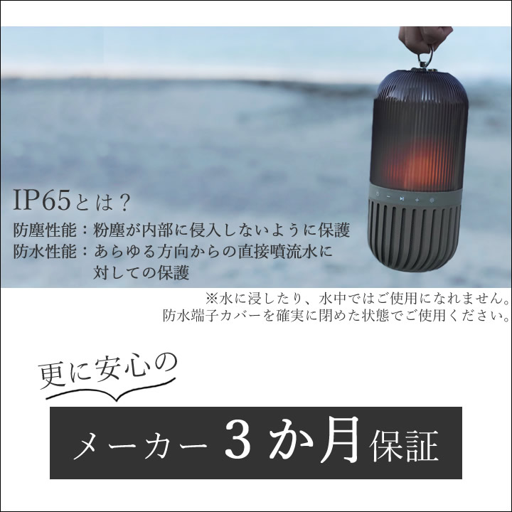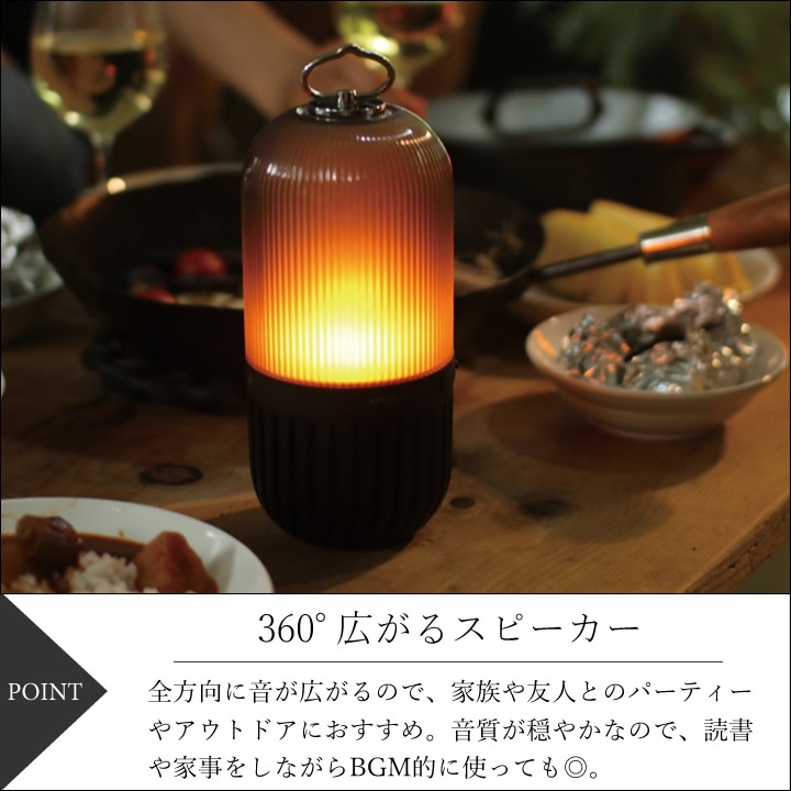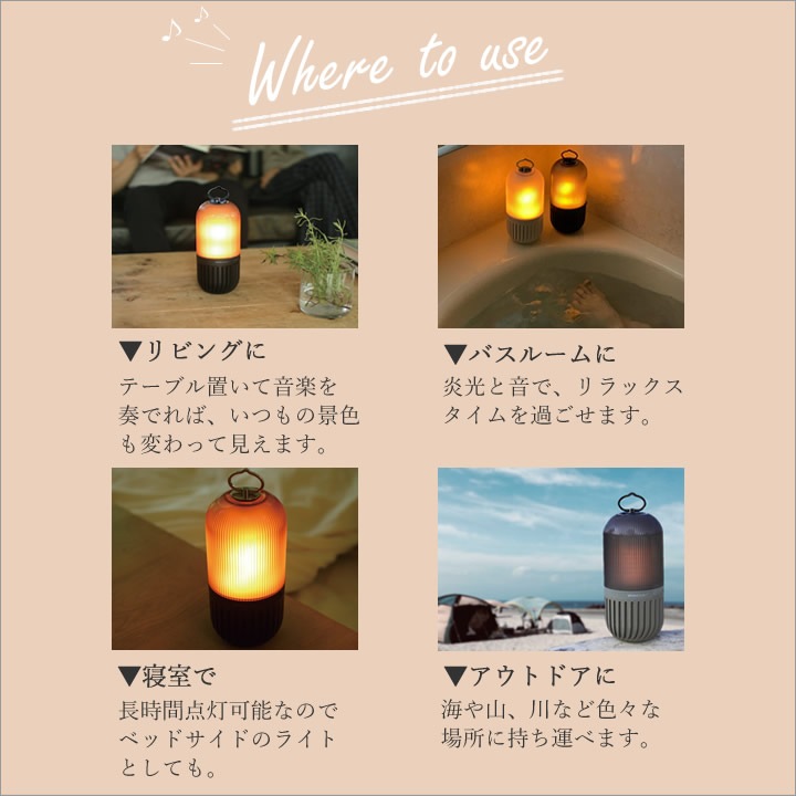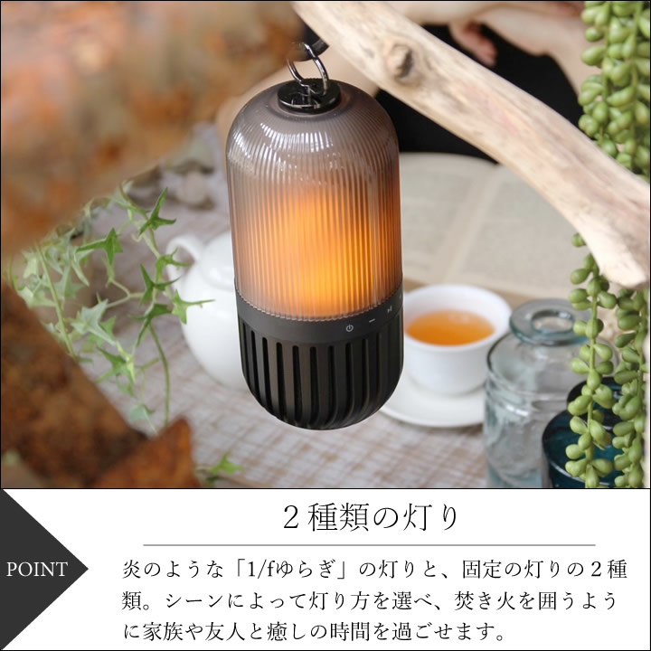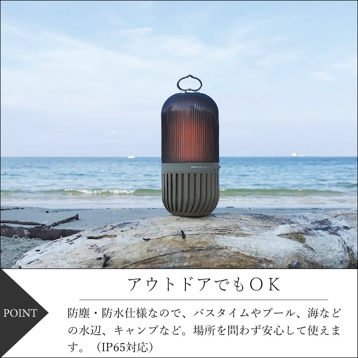 焚き火のように ゆらぐ優しい灯りと 音楽を共に楽しめる 充電式カプセルスピーカー 。 リビング や お風呂 でも どこでも使えるので いつものお部屋が 癒しの空間に大変身。 防塵・防水仕様で アウトドア でも活躍。 おうち以外でも特別な空間を お届けします。 いつもの場所に 癒しの空間を提供する カプセルスピーカー です。