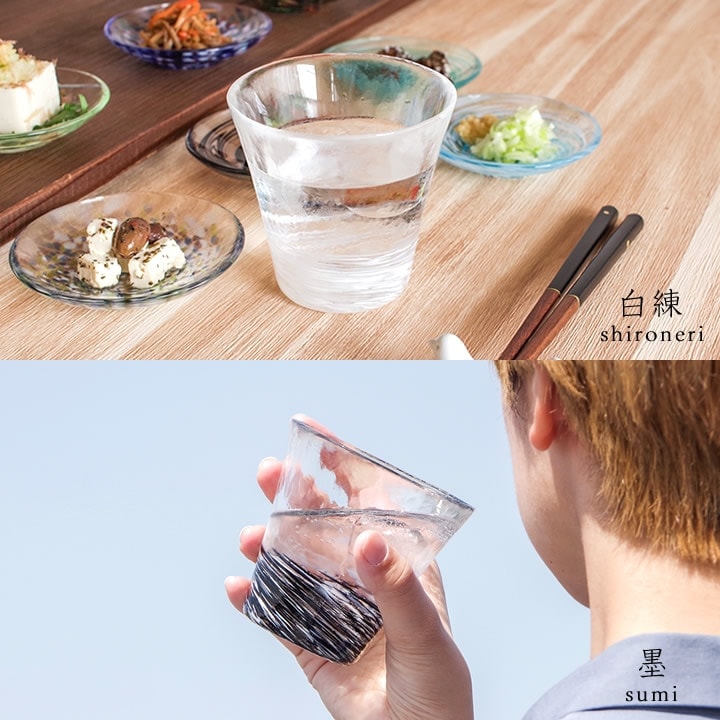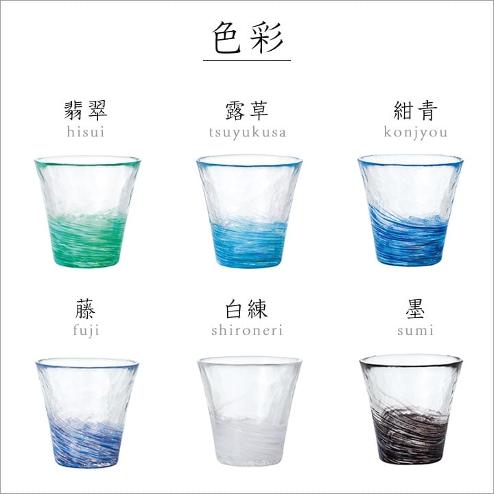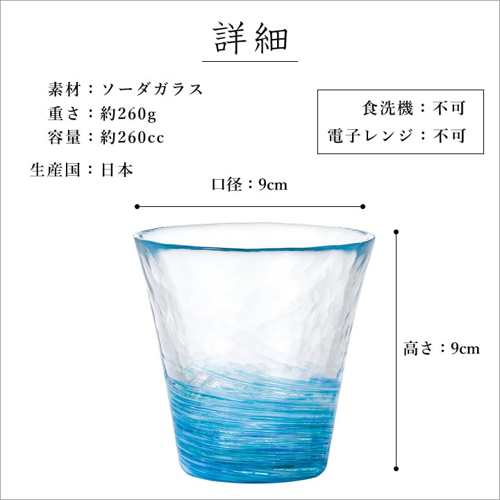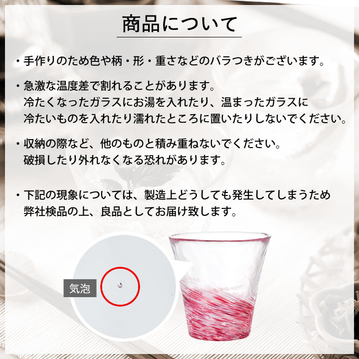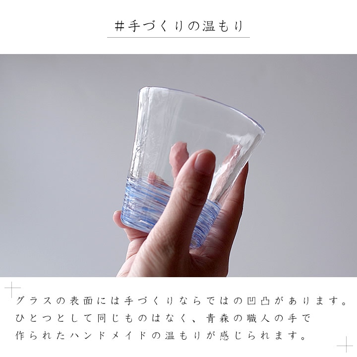 ![]() グラス の表面には 手づくり ならではの凹凸があります。ひとつとして同じものはなく、青森の職人の手で作られた ハンドメイド の温もりが感じられます。 |