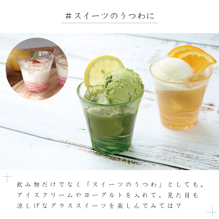 ![]() 飲み物 だけでなく「 スイーツ の うつわ 」としても。 アイスクリーム や ヨーグルト を入れて、見た目も涼しげな グラス スイーツ を楽しんでみては? ![]() |