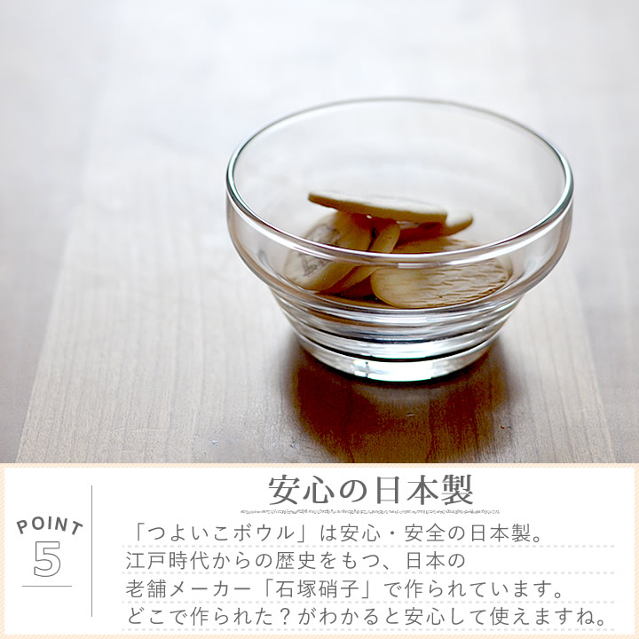 ![]() 「 つよいこボウル 」は安心・安全の 日本製 。江戸時代からの歴史をもつ、 日本 の老舗メーカー「 石塚硝子 」で作られています。どこで作られた?がわかると安心して使えますね。 |