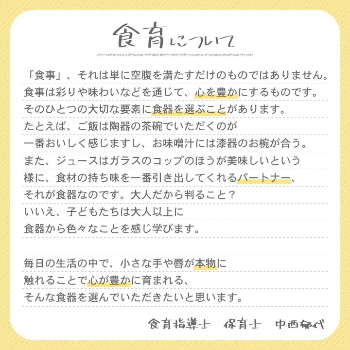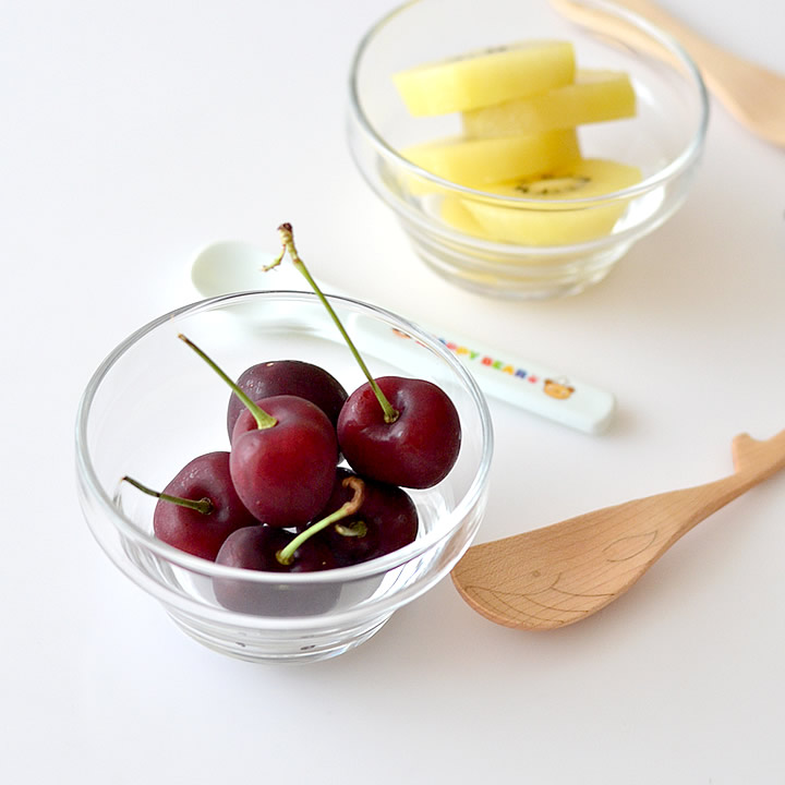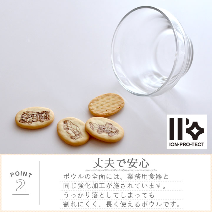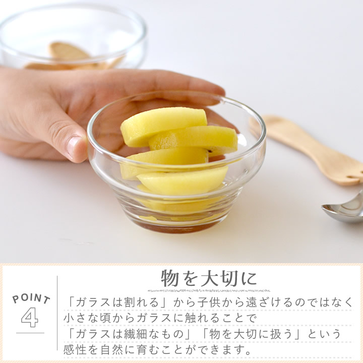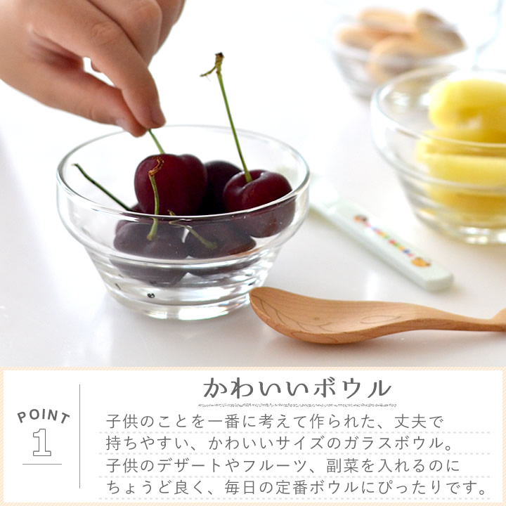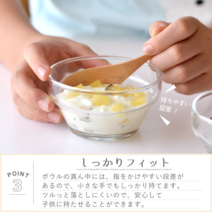 子供 のことを一番に考えて作られた、 丈夫 で 持ちやすい かわいい サイズ の ガラスボウル 。 |