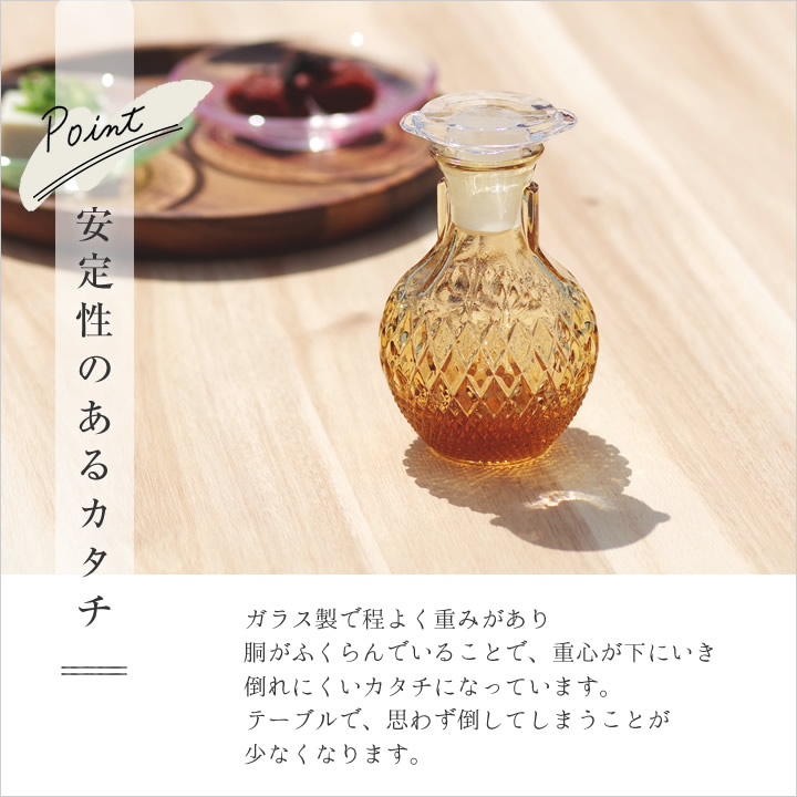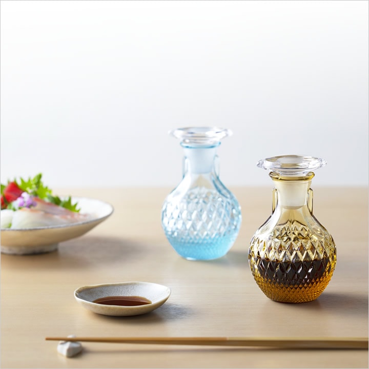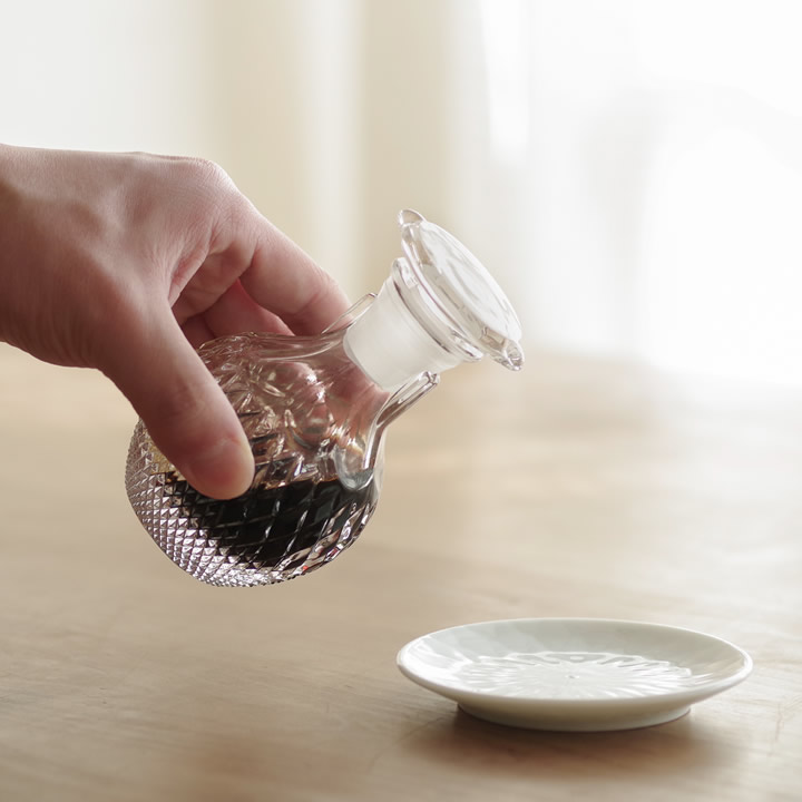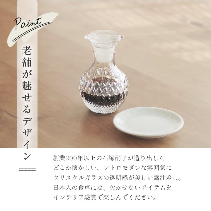 創業200年以上の 石塚硝子 が造り出した、どこか懐かしい レトロモダン な雰囲気に、 クリスタルガラス の透明感が美しい 醤油差し 。 |