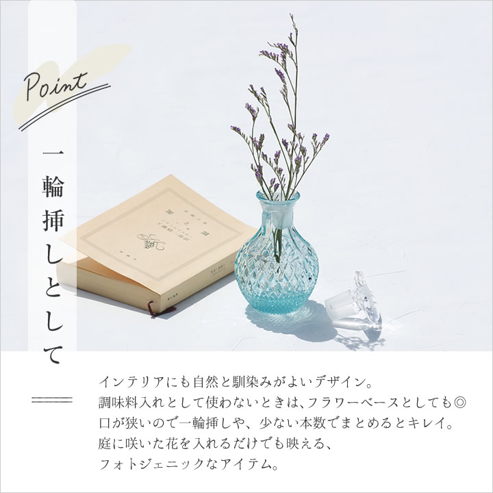 ![]() インテリア にも自然と馴染みがよい デザイン 。 調味料入れ として使わないときは、 フラワーベース としても◎。口が狭いので 一輪挿し や、少ない本数でもキレイにまとまります。庭に咲いた花を入れるだけでも映える フォトジェニック なアイテムです。 |