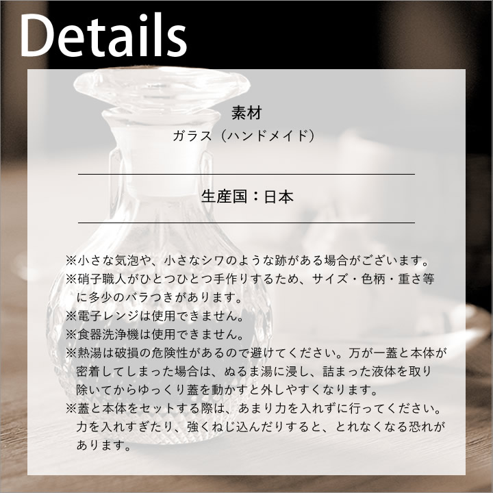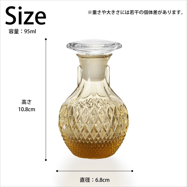 ![]() 胴部分は滑りにくい ガラス 細工で手にちょうど収まるほどのサイズ感。手が小さな方でも持ちやすく、キュッとくびれた口の部分が手にフィットします。 |
