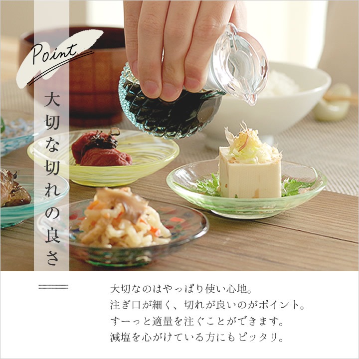 ![]() 大切なのはやっぱり使い心地。 注ぎ口 が細く、切れが良いのがポイント。すーっと適量を注ぐことができます。 減塩 を心がけている方にもピッタリ。 |