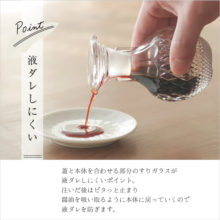 ![]() 蓋と本体を合わせる部分の すりガラス が 液ダレ しにくいポイント。注いだ後はピタっと止まり、 醤油 を吸い取るように本体に戻っていくので 液ダレ を防ぎます。 |