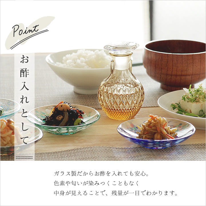![]() ガラス 製だから お酢 を入れても安心。色素や匂いが染みつくこともなく、中身が見えることで残量が一目でわかります。 |
