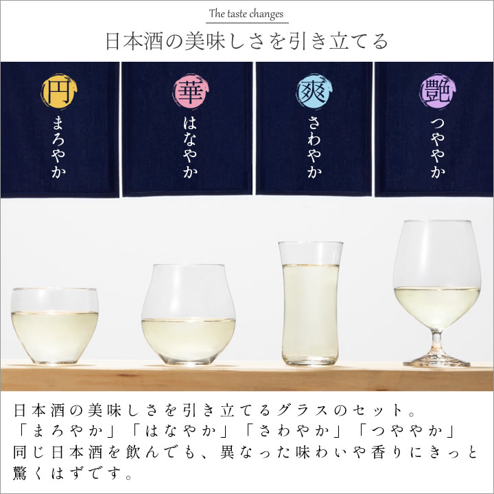 ![]() 日本酒 の美味しさを引き立てる グラス の セット 。「 まろやか 」「 はなやか 」「 さわやか 」「 つややか 」。同じ 日本酒 を飲んでも、異なった味わいや香りにきっと驚くはずです。 |