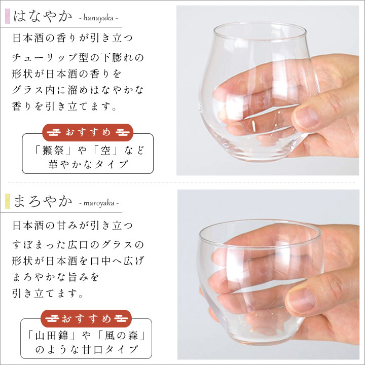 ![]() 日本酒 の香りが引き立つ「 はなやか 」。チューリップ型の下膨れの形状が 日本酒 の香りをグラス内に溜め、はなやかな香りを引き立てます。「 獺祭 」や「 八海山 」のような、 フルーティー で華やかな 日本酒 に おすすめ です。 |