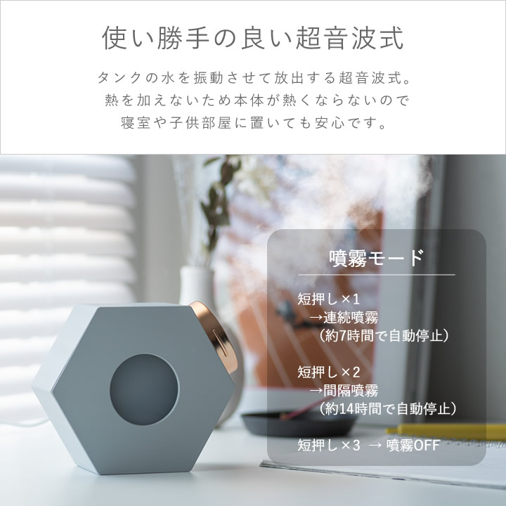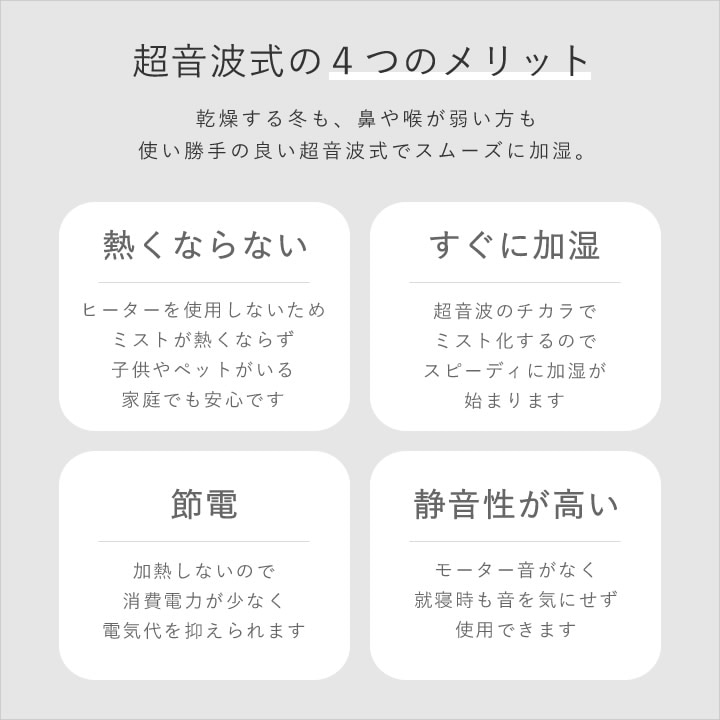 ![]() タンクの水を振動させて放出する 超音波式 。 熱を加えないため本体が熱くならないので 寝室 や 子供部屋 に置いても安心です。