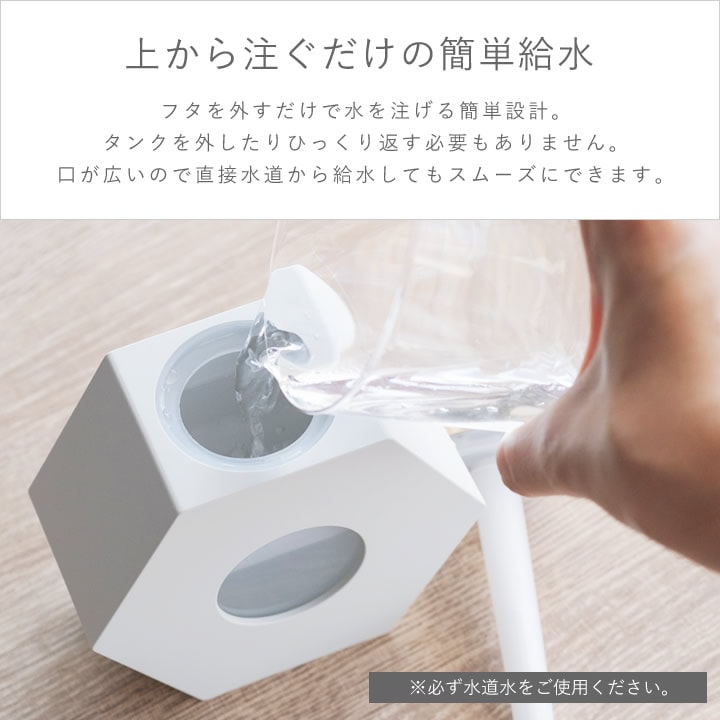 ![]() フタを外すだけで水を注げる簡単設計。 タンクを外したりひっくり返す必要もありません。口が広いので直接水道から給水してもスムーズにできます。