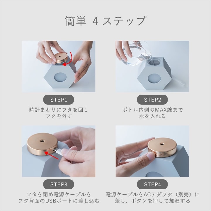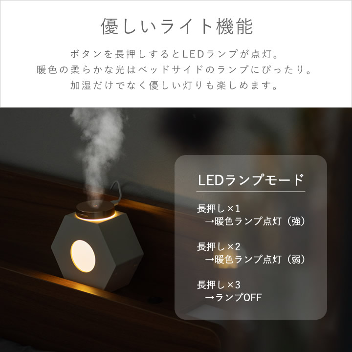 ![]() ボタン を長押しすると LED ランプ が点灯。 暖色の柔らかな光は ベッドサイド のランプにぴったり。加湿だけでなく優しい灯りも楽しめます。 |