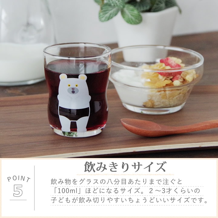 ![]() 飲み物を グラス の八分目あたりまで注ぐと「 100ml 」ほどになる サイズ 。 2~3才 くらいの 子ども が飲み切りやすいちょうどいい サイズ です。 |