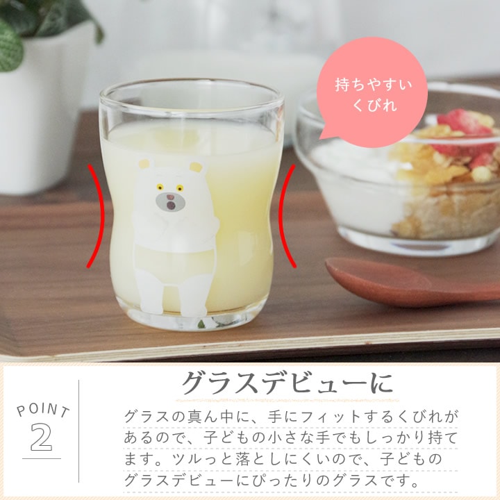 ![]() グラス の真ん中に、手に フィット するくびれがあるので、 子ども の小さな手でもしっかり持てます。ツルっと落としにくいので、 子ども の グラスデビュー にぴったりの グラス です。 |