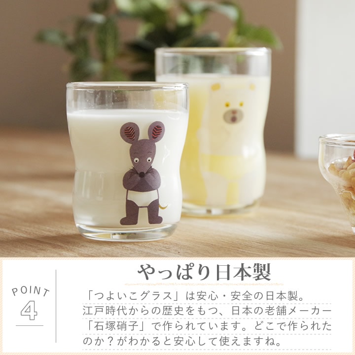 ![]() 「 つよいこグラス 」は 安心 ・ 安全 の 日本製 。江戸時代からの歴史をもつ、日本の老舗メーカー「 石塚硝子 」で作られています。どこで作られた?がわかると 安心 して使えますね。 ![]() |