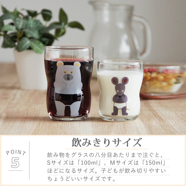 ![]() 飲み物を グラス の八分目あたりまで注ぐと、 Sサイズ は「 100ml 」、 Mサイズ は「 150ml 」ほどになる サイズ 。 子ども が飲み切りやすいちょうどいい サイズ です。 |
