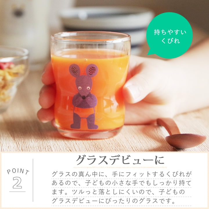 ![]() グラス の真ん中に、手に フィット するくびれがあるので、 子ども の小さな手でもしっかり持てます。ツルっと落としにくいので、 子ども の グラスデビュー にぴったりの グラス です。 |