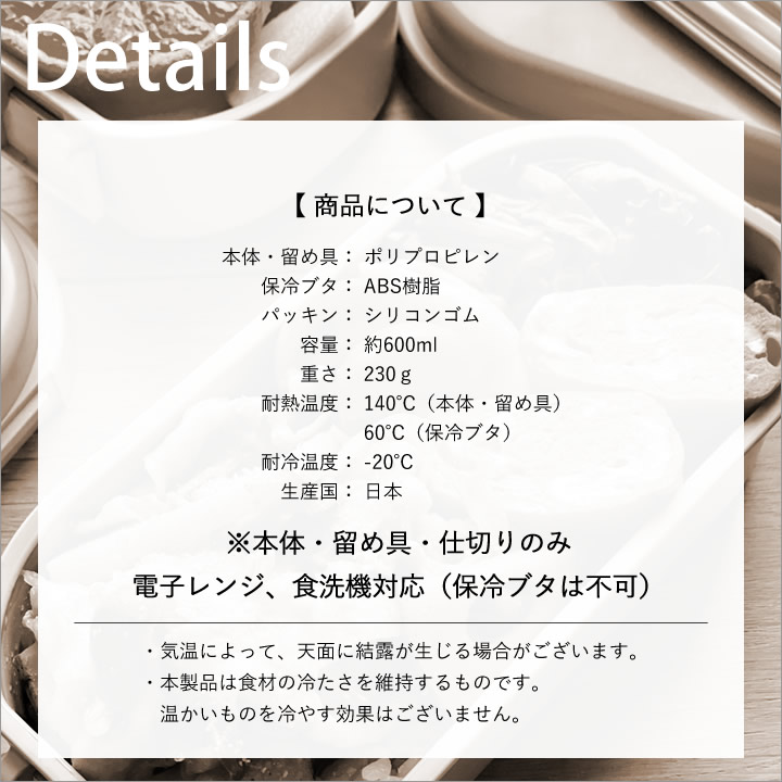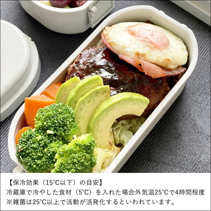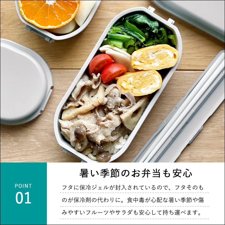 ![]() フタに 保冷ジェル が封入されているので、フタそのものが 保冷剤 の代わりに。 食中毒 が心配な暑い季節や傷みやすい フルーツ や サラダ も安心して持ち運べます。 |