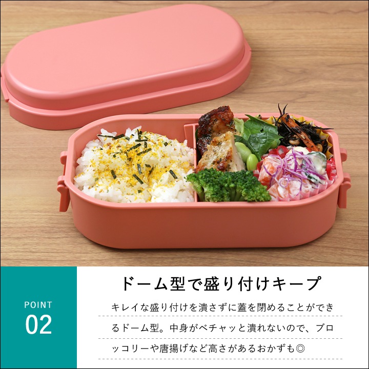 ![]() キレイな盛り付けを潰さずに蓋を閉めることができる ドーム型 。中身がベチャッと潰れないので、ブロッコリーや唐揚げなど高さがある おかず も◎ |