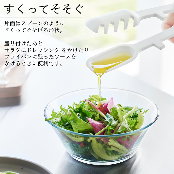 ![]() 片面は スプーン のようにすくってそそげる形状。 盛り付け たあとサラダにドレッシング をかけたり、 フライパン に残ったソースをかけるときに便利です。 |