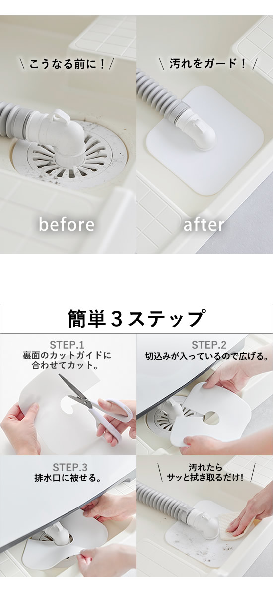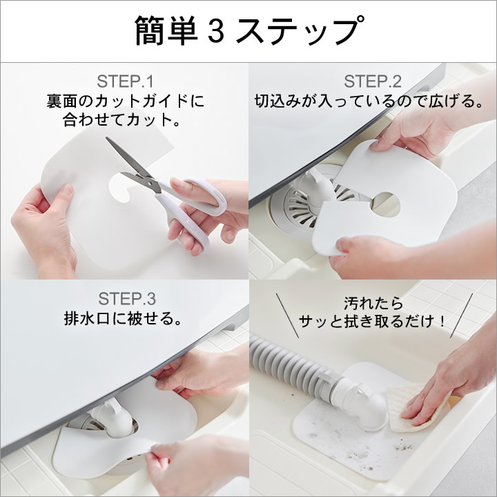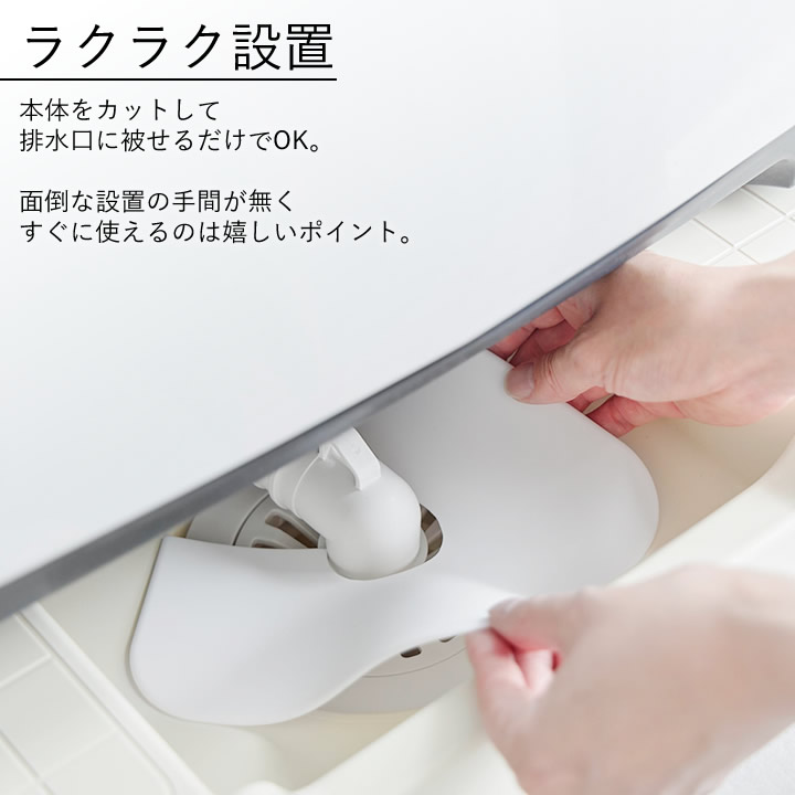![]() 本体をカットして排水口に被せるだけでOK。面倒な設置の手間が無く、すぐに使えるのは嬉しいポイント。 ![]() |