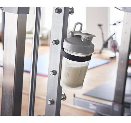 ![]() プロテインシェイカーや水筒も器具にくっつけて、浮かせて一時置き。床に置かないので衛生的です。 |