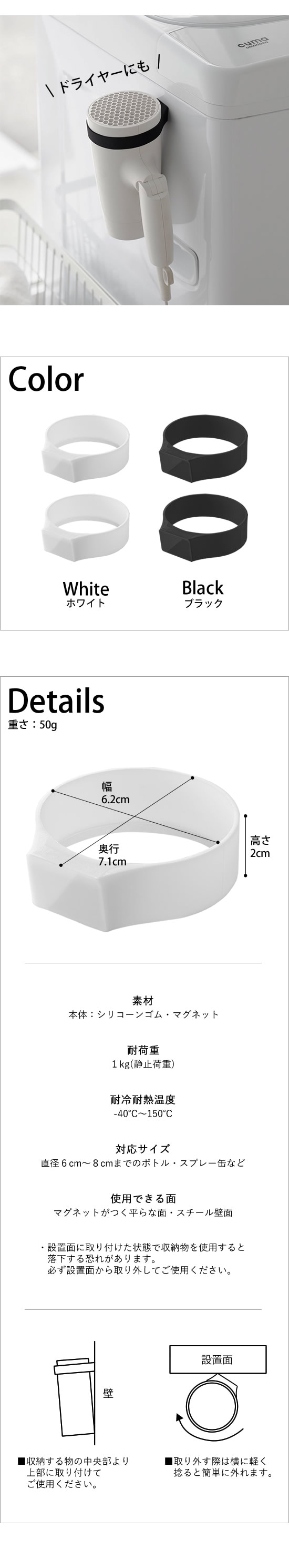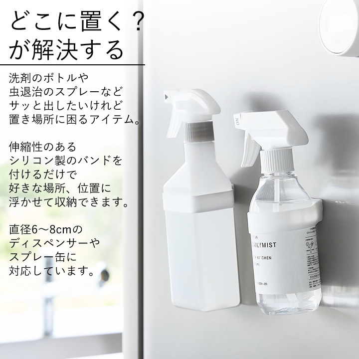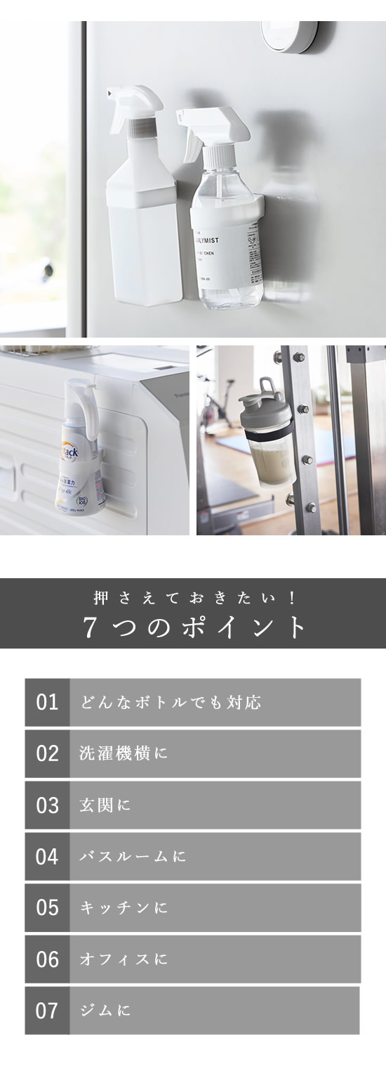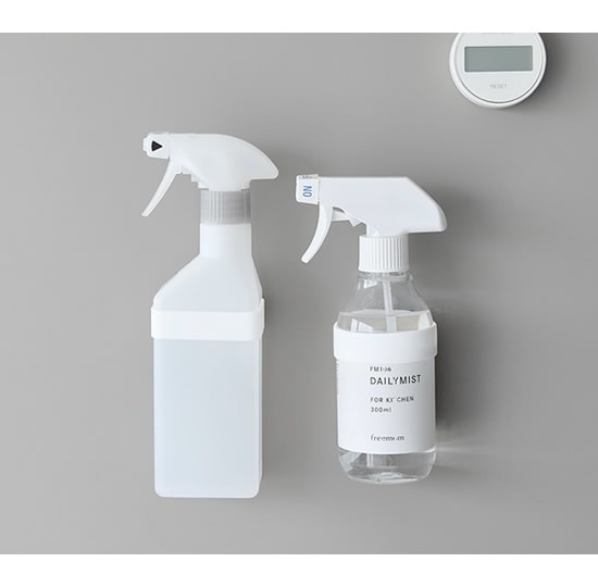 ![]() スプレーボトルや食器用洗剤、ごま油などのボトルに使っても。冷蔵庫横や磁石が付くパネル部分に取りつければ、家事動線もスムーズ。 |