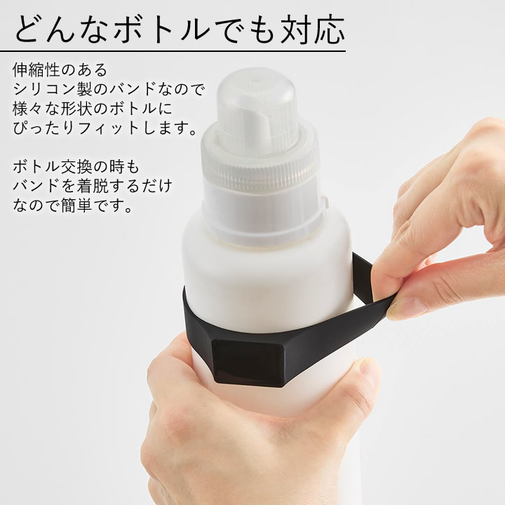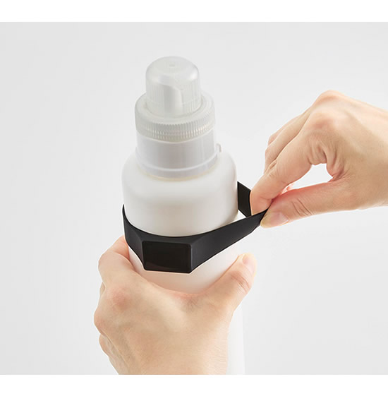 ![]() 伸縮性のあるシリコン製のバンドなので、様々な形状のボトルにぴったりフィットします。ボトル交換の時もバンドを着脱するだけなので簡単です。 |