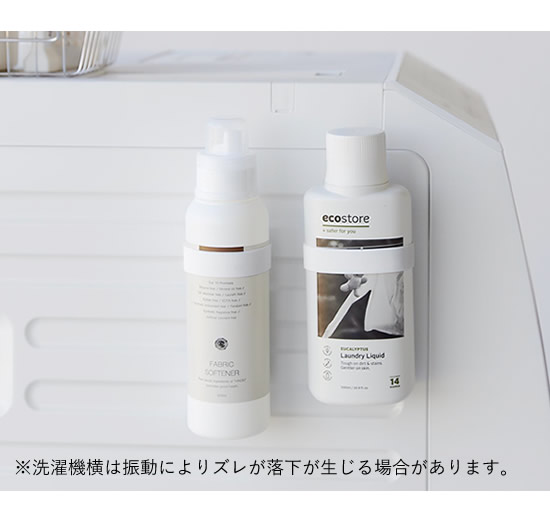 ![]() 置き場所に困る洗剤や柔軟剤は、バンドをつけて洗濯機横に浮かせて収納。生活感をオフしながら、狭い洗濯機まわりも広く使えて◎ |