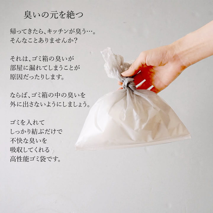 ![]() 使い方は簡単。ゴミを入れて、結んで捨てるだけ。消臭剤配合のフィルムが臭いの成分を吸収し不快な臭いを吸収します。 |
