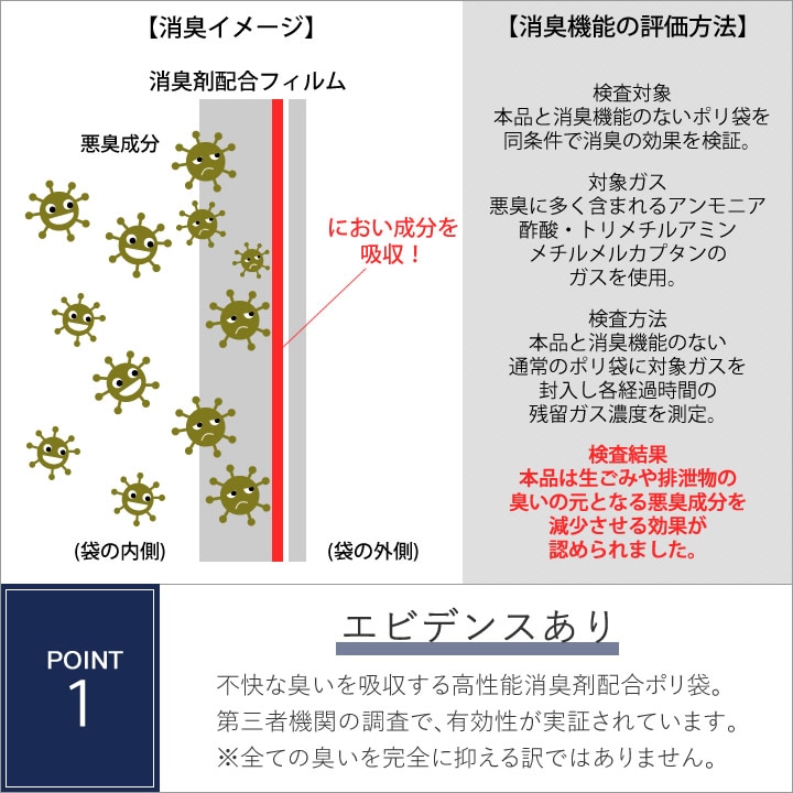 ![]() 不快な臭いを吸収する高性能消臭剤配合ポリ袋。第三者機関の調査で、有効性が実証されています。※全ての臭いを完全に抑える訳ではありません。 ![]() |
