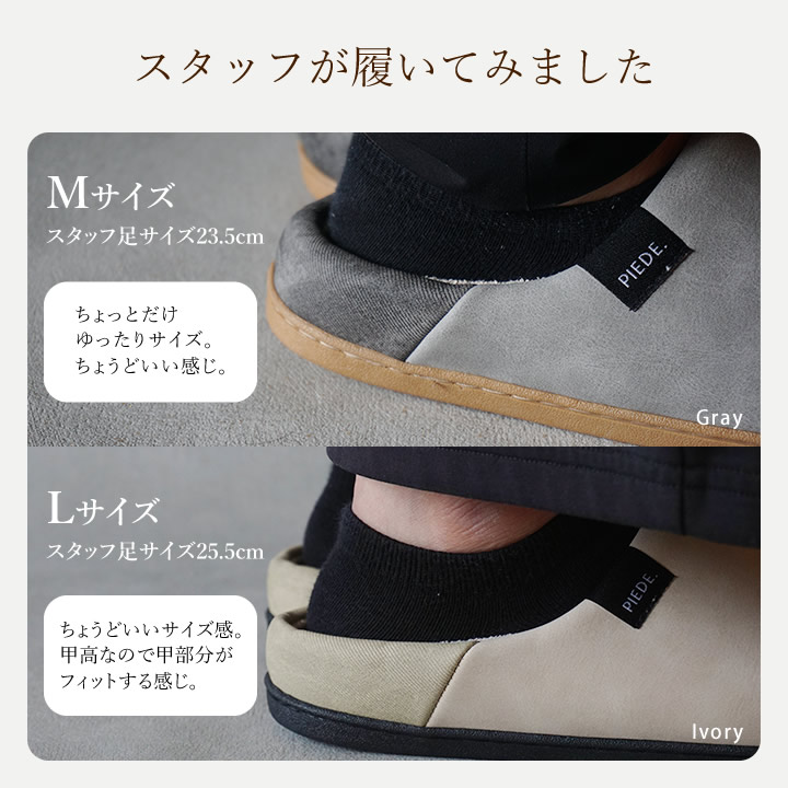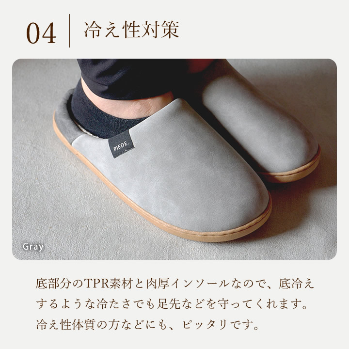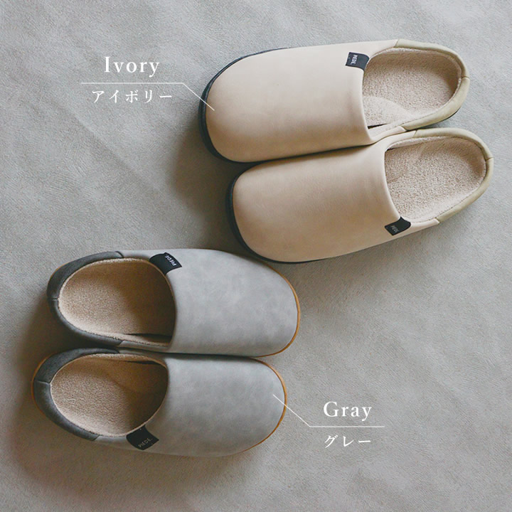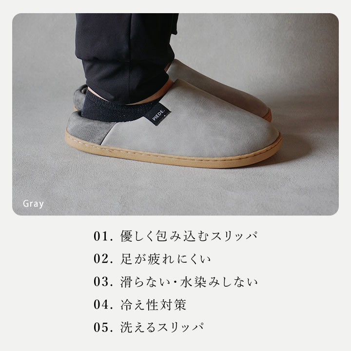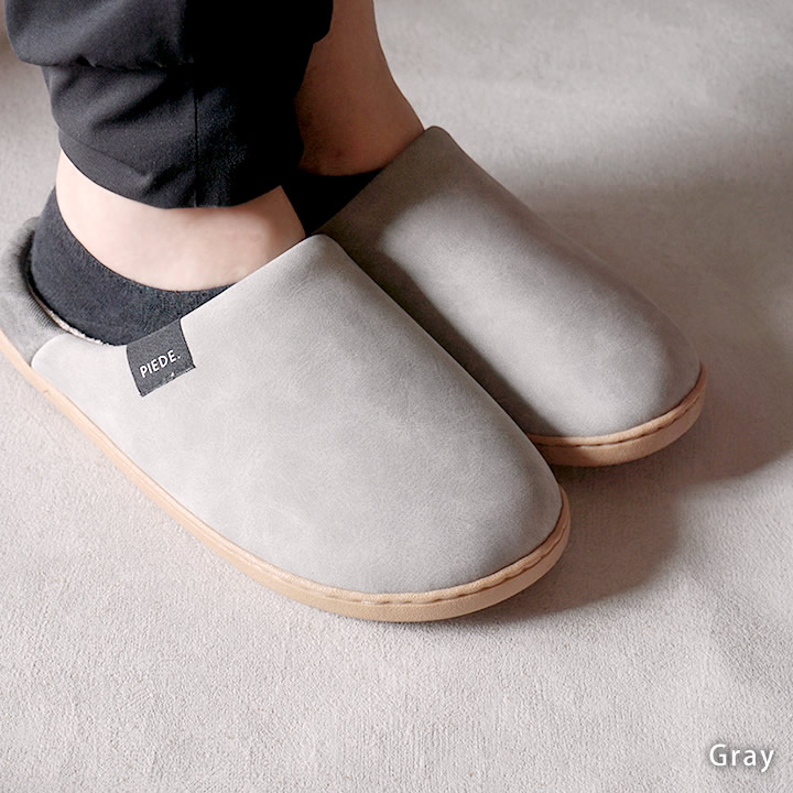 ![]() 足にストレスをかけず、ゆったり履けるスリッパです。ムラ感のあるフェイクレザーを使用した高級感のあるデザイン。足を優しく包み込み、立ち仕事でも疲れにくいのが特徴です。 |