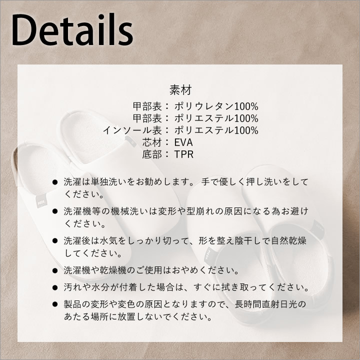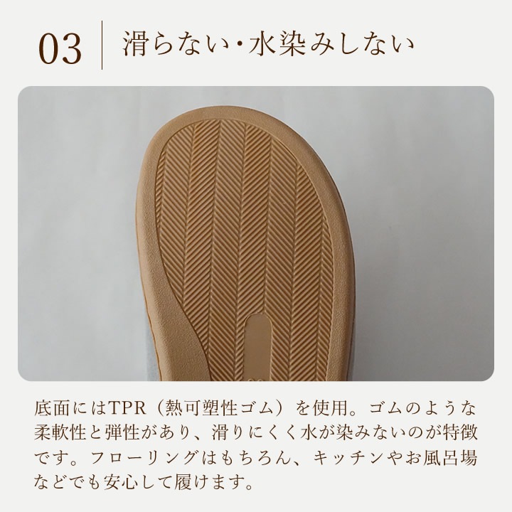 ![]() 底面にはTPR(熱可塑性ゴム)を使用。ゴムのような柔軟性と弾性があり、滑りにくく水が染みないのが特徴です。フローリングはもちろん、キッチンやお風呂場などでも安心して履けます。 |