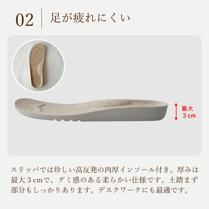 ![]() スリッパでは珍しい高反発の肉厚インソール付き。厚みは最大3cmで、グミ感のある柔らかい仕様です。土踏まず部分もしっかりあります。デスクワークにも最適です。 |