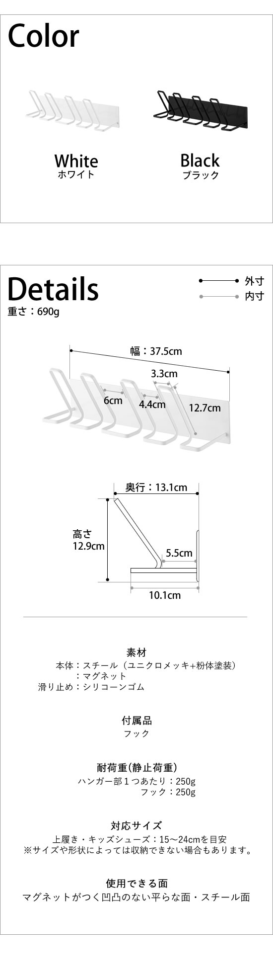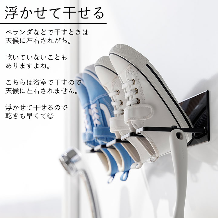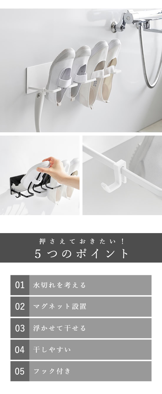 ![]() 強力なマグネットで浴室につけるだけの簡単設計。その日から上履きやキッズシューズ、スリッパなどを乾かせます。 |