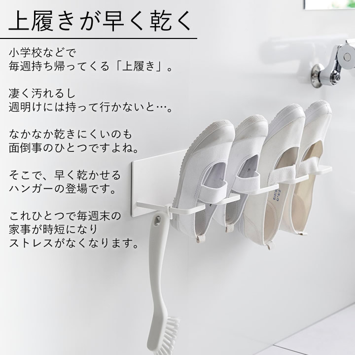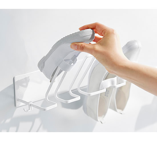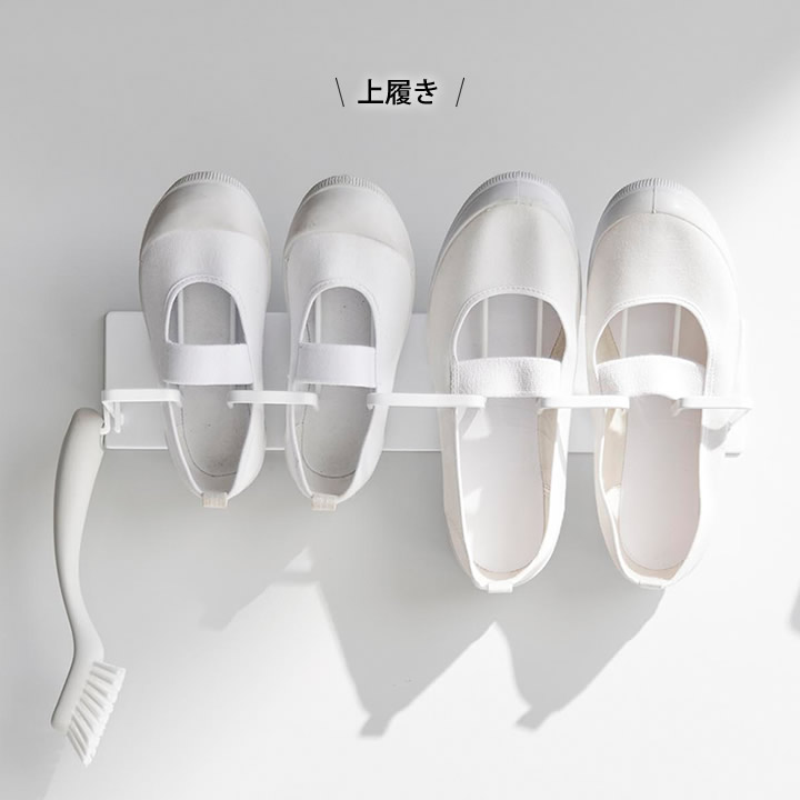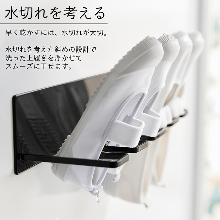 ![]() 早く乾かすには、水切れが大切。水切れを考えた斜めの設計で、洗った上履きを浮かせてスムーズに干せます。 |