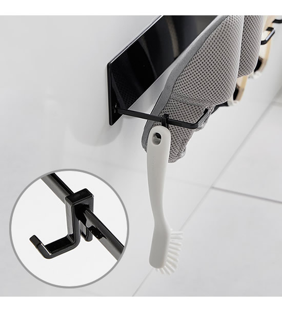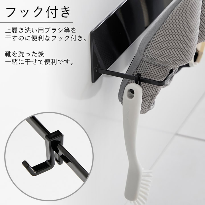 ![]() 上履き洗い用ブラシ等を干すのに便利なフック付き。靴を洗った後、一緒に干せて便利です。 |